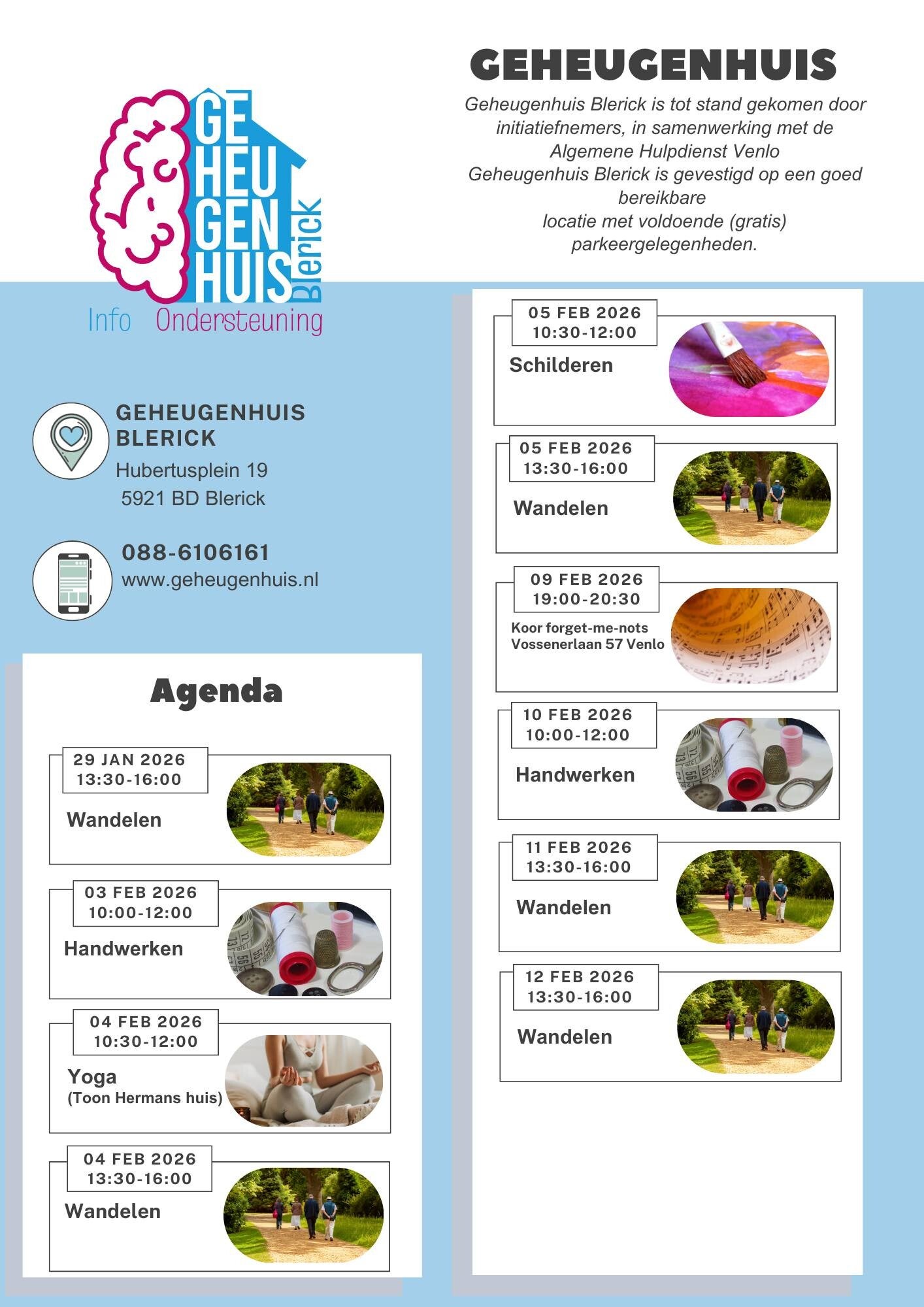 Het Geheugenhuis Blerick en Venlo is een gastvrije ontmoetingsplek voor mensen met (beginnende) geheugenproblemen, hun mantelzorgers en iedereen die actief wil blijven deelnemen aan de samenleving. Het biedt informatie, ondersteuning en diverse activiteiten die bijdragen aan een gezond geheugen en een betekenisvol leven.